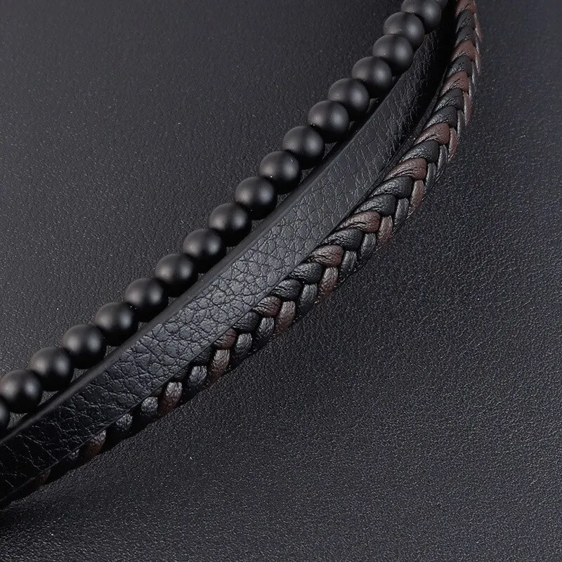 Men Classic Fashion High Quality Leather Bracelet Obsidian Beaded Multi Layer Leather Bracelet For Men Jewelry Gift
